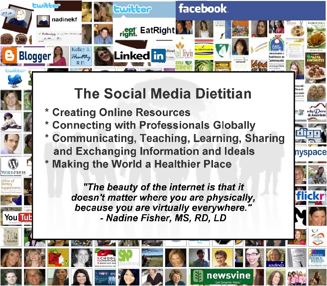 The dietitian is using Social Media to communicate, teach, learn, share and exchange information and ideas. The dietitian can be found: