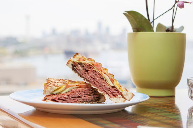 Rye Bread with mustard, lettuce, tomato, pastrami, and Swiss cheese.